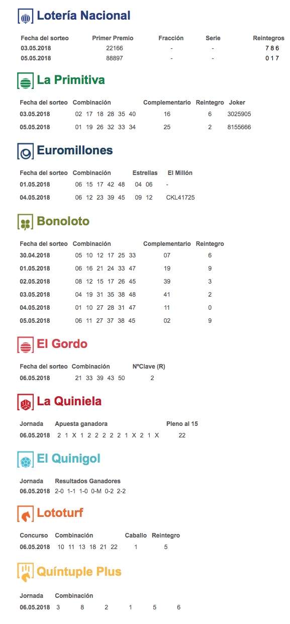 Inicio Oia Resultados de los sorteos de Loterías de la semana del 30 de... Oia Resultados de los sorteos de Loterías de la semana del 30 de abril al 6 de mayo Por Redacción - 09/05/2018 FacebookXWhatsAppTelegram Resumen de los resultados de los sorteos de la Lotería Nacional, la Primitiva, la Euromillones, la Bonoloto, la Quiniela, el Gordo de la Primitiva, el Quinigol, la Lototurf y la Quíntuple Plus de la semana del 30 de abril al 6 de mayo. El Tiempo Oia lluvia ligera enter location 15 ° C 15 ° 15 ° 100 % 5.7kmh 75 % Jue 15 ° Vie 19 ° Sab 16 ° Dom 17 ° Lun 17 °