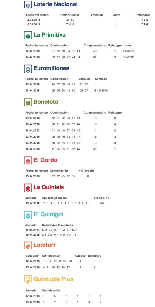 Inicio Oia Resultados de los sorteos de Loterías de la semana del 9 al... Oia Resultados de los sorteos de Loterías de la semana del 9 al 15 de abril Por Redacción - 16/04/2018 FacebookXWhatsAppTelegram Resumen de los resultados de los sorteos de la Lotería Nacional, la Primitiva, la Euromillones, la Bonoloto, la Quiniela, el Gordo de la Primitiva, el Quinigol, la Lototurf y la Quíntuple Plus de la semana del 9 al 15 de abril. El Tiempo Oia lluvia ligera enter location 15 ° C 15 ° 15 ° 100 % 5.7kmh 75 % Jue 15 ° Vie 19 ° Sab 16 ° Dom 17 ° Lun 17 °