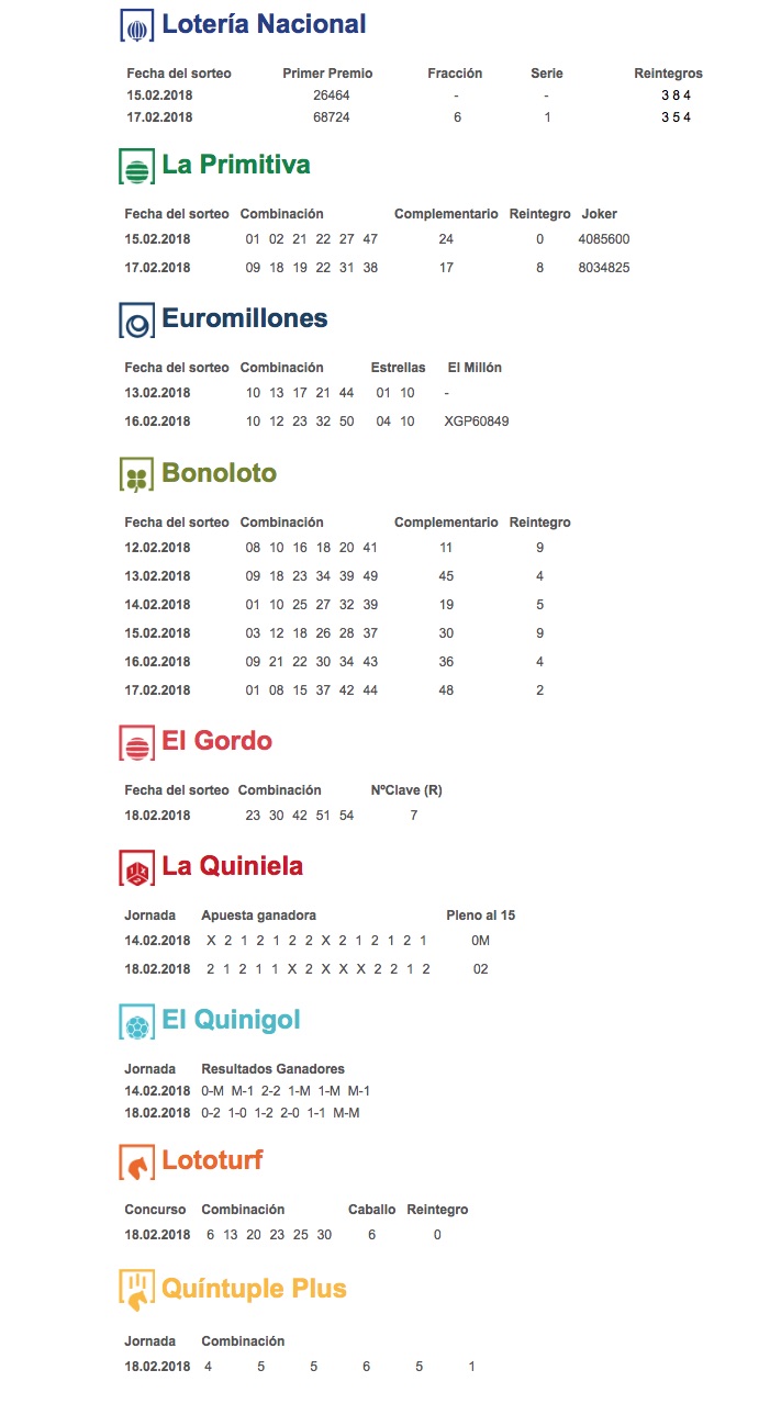 Resumen de los resultados de los sorteos de la Lotería Nacional, la Primitiva, la Euromillones, la Bonoloto, la Quiniela, el Gordo de la Primitiva, el Quinigol, la Lototurf y la Quíntuple Plus de la semana del 12 al 18 de febrero.