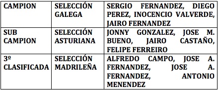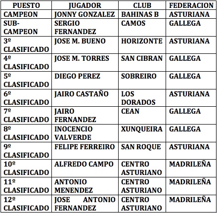 Participaron un total de 12 xogadores das Comunidades de Asturias, Galicia e Madrid. As fases de clasificación xogaronse durante o sábado e o domingo disputouse a final.