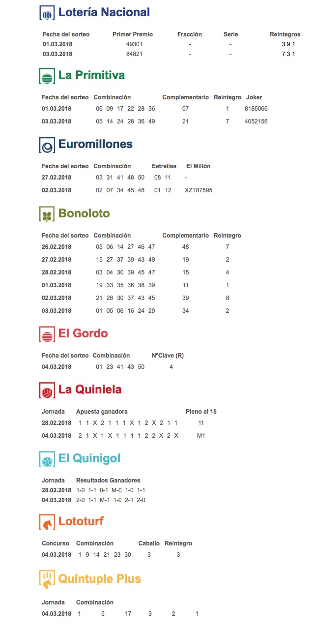 Inicio Oia Resultados de los sorteos de Loterías de la semana del 26 de... Oia Resultados de los sorteos de Loterías de la semana del 26 de febrero al 4 de marzo Por Redacción - 05/03/2018 FacebookXWhatsAppTelegram Resumen de los resultados de los sorteos de la Lotería Nacional, la Primitiva, la Euromillones, la Bonoloto, la Quiniela, el Gordo de la Primitiva, el Quinigol, la Lototurf y la Quíntuple Plus de la semana del 26 de febrero al 4 de marzo. El Tiempo Oia lluvia ligera enter location 15 ° C 15 ° 15 ° 100 % 5.7kmh 75 % Jue 15 ° Vie 19 ° Sab 16 ° Dom 17 ° Lun 17 °