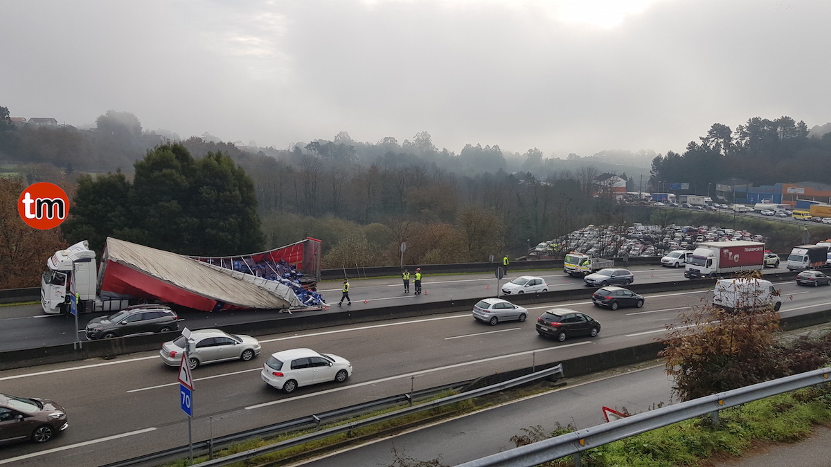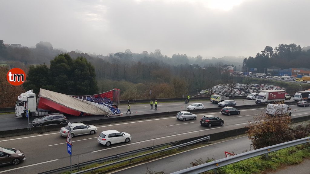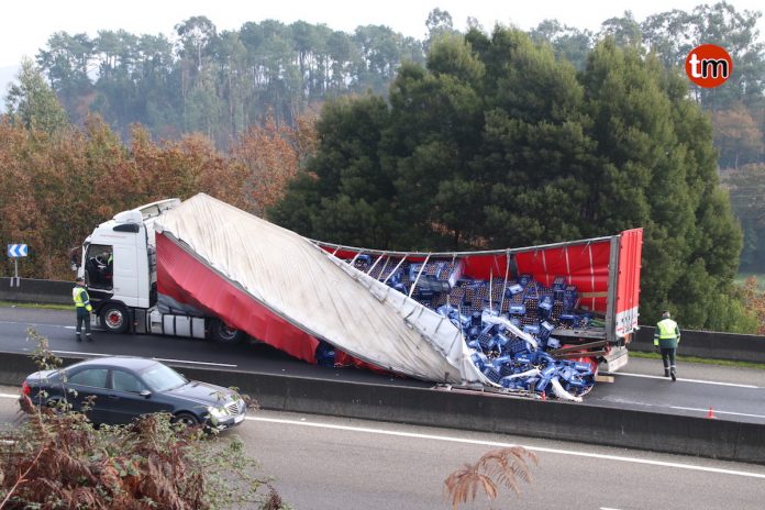 El suceso ocurrió sobre las 10:15 horas de esta mañana a la altura de un desguace en el Concello de Mos. La mercancía quedó ocupando gran parte de la vía, lo que obligó a cortar uno de los carriles de subida. No se han producido heridos.