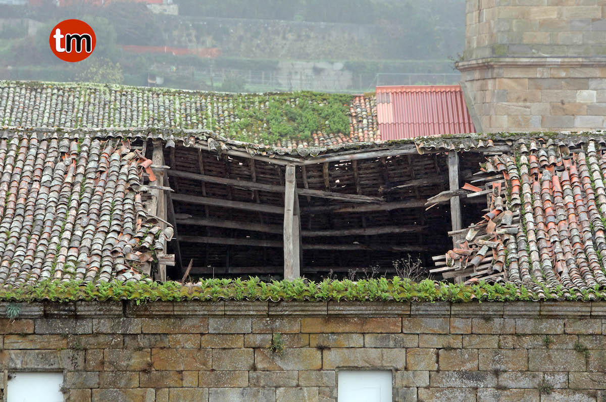 Parte del techo del ala norte del monasterio de Oia se vino abajo en la madrugada de este viernes, como consecuencia de las ligeras lluvias caídas y del abandono que lleva sufriendo el cenobio del siglo XII desde hace años, lo que agrava aún más su estado.