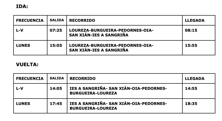 La línea de la empresa Lugove que dará el citado servicio será la “ruta XG8836601 IES A Sangriña-San Xián-Oia- Pedornes- Burgueira- Loureza”, con los horarios (de lunes a viernes) que se acercan en la siguiente tabla: