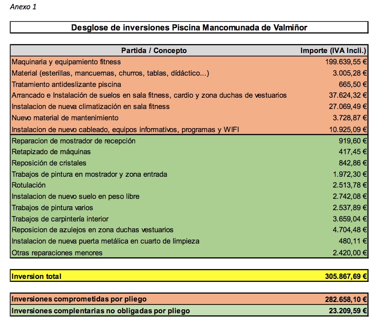 Así mismo, han aparecido diferentes noticias en las que se cuestionaba la inversión comprometida en el pliego, inversión que no solo ha dado debido cumplimiento al mismo, y ha quedado sobradamente acreditada ante la Mancomunidad con la presentación de las perceptivas facturas, sino que ha sido incrementada por la concesionaria con trabajos no recogidos ni obligados en el pliego. En el anexo 1 desglosamos por partida e importe la inversión total ejecutada que asciende a un total de 305.867,69€.