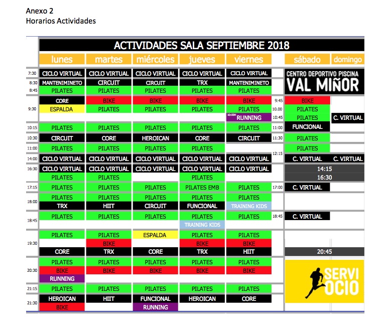 En referencia a la supuesta reducción de actividades en el centro deportivo, a las que se han referido en algunos foros, queremos dejar claro que las actividades planificadas cumplen puntualmente con lo recogido en el pliego de contratación, tanto en número como en forma y que, si se han visto afectadas en algún momento, se ha debido al retraso en la recepción del equipamiento. En el anexo 2, se puede observar las plantillas de horarios planificadas para septiembre de 2018.