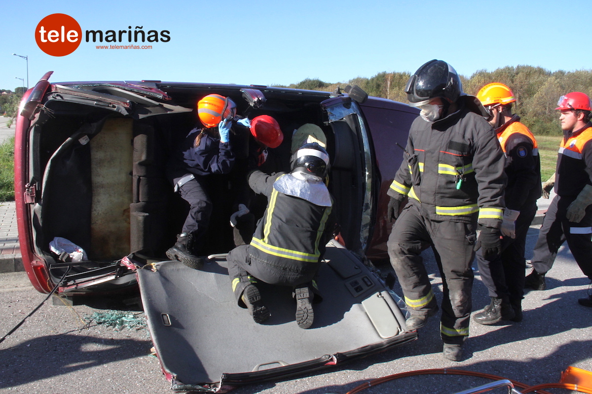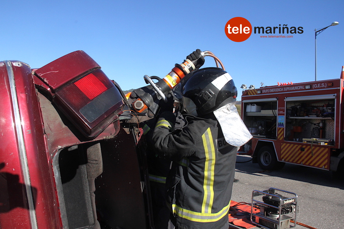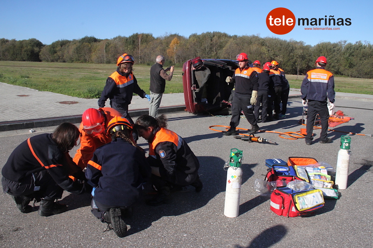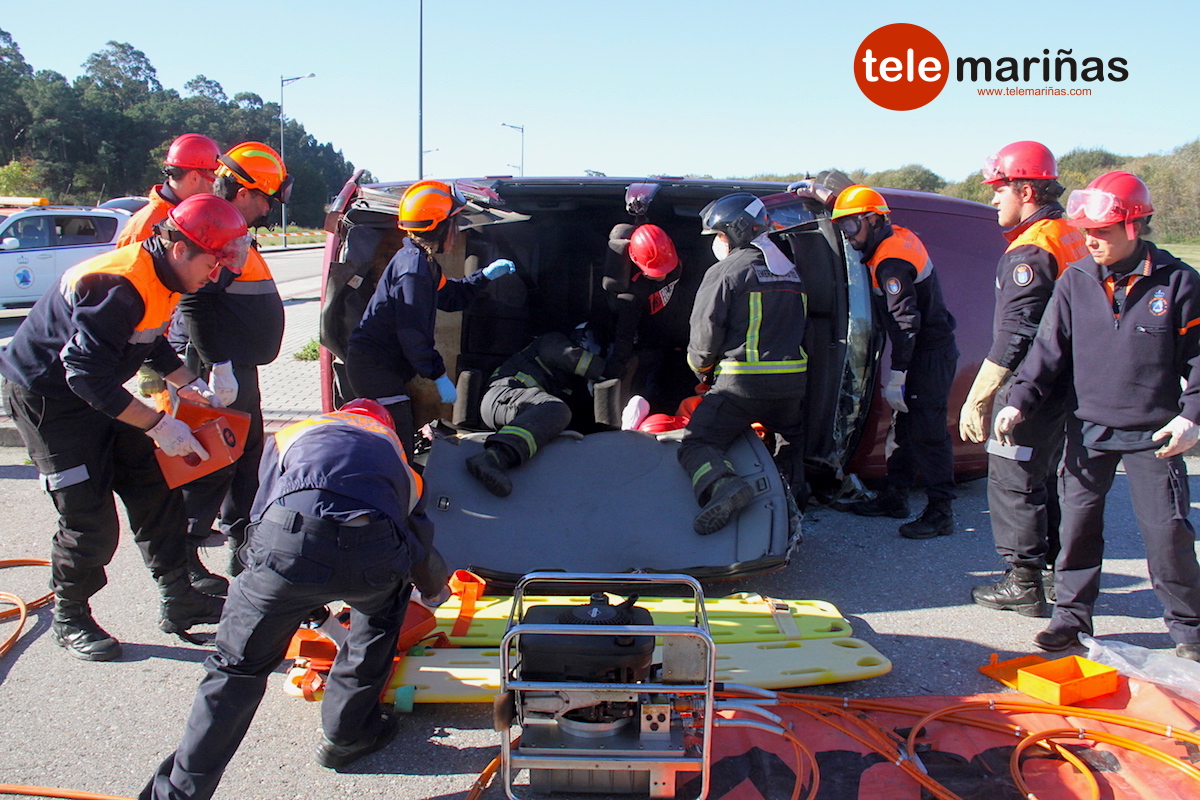 La simulación consistió en el rescate de una persona por atropello y de dos víctimas atrapadas en un turismo que volcó. “Se hizo una extracción con excarcelación total con puertas y techo. Al ser en el interior de un coche y al tratarse de un accidente de tráfico, se consideró a las víctimas con politraumatismo y se retiraron con tableros”, relató Marta González, voluntaria de Protección Civil de O Val Miñor.