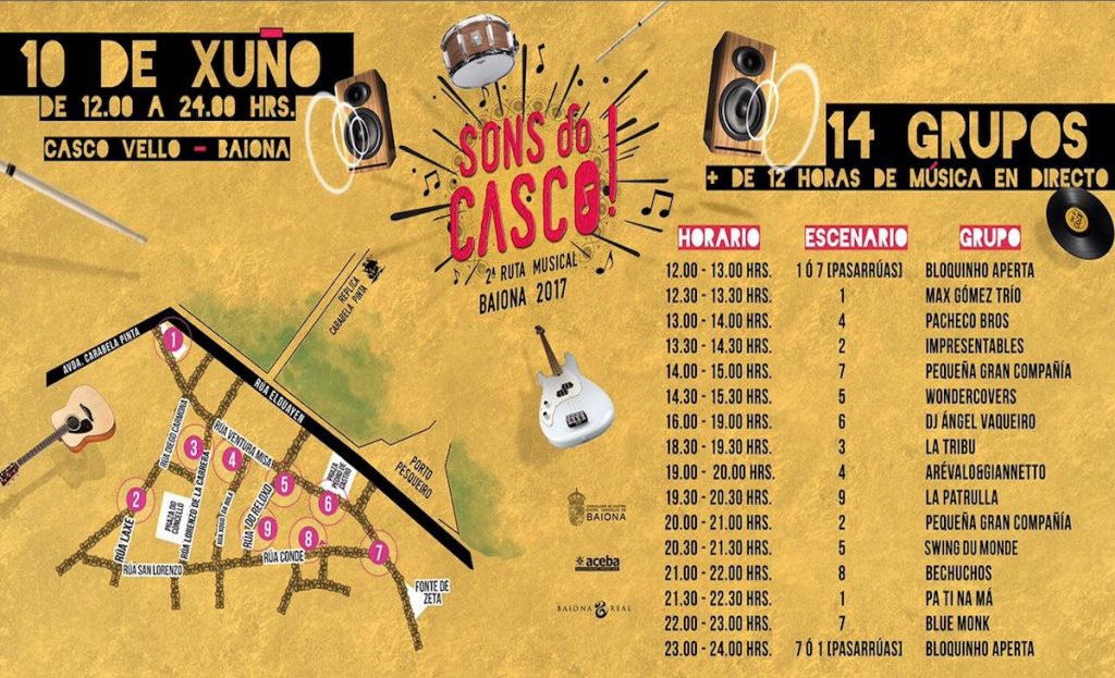 Desde las 12:00 hasta las 00:00 de este sábado, 14 grupos de diferentes estilos actuarán en 9 escenarios situados en diferentes rincones del casco viejo baionés, como la Plaza del Concello, la Plaza del Padre Fernando, a Fonte da Laxe, Fonte de Zeta, Plaza de Pedro de Castro o los jardines de la Casa de la Navegación.