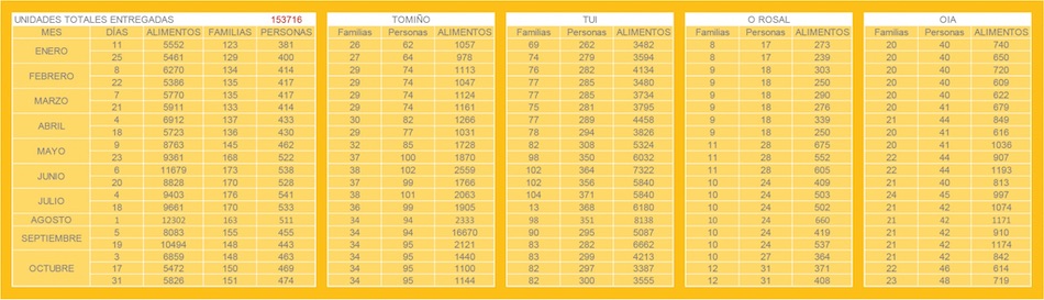 Tal y como está programado en el calendario anual de entrega de alimentos, la Asociación Asistencial SOS Tomiño Baixo Miño, hizo tres entregas de alimentos en el mes de octubre a familias necesitadas de la comarca.