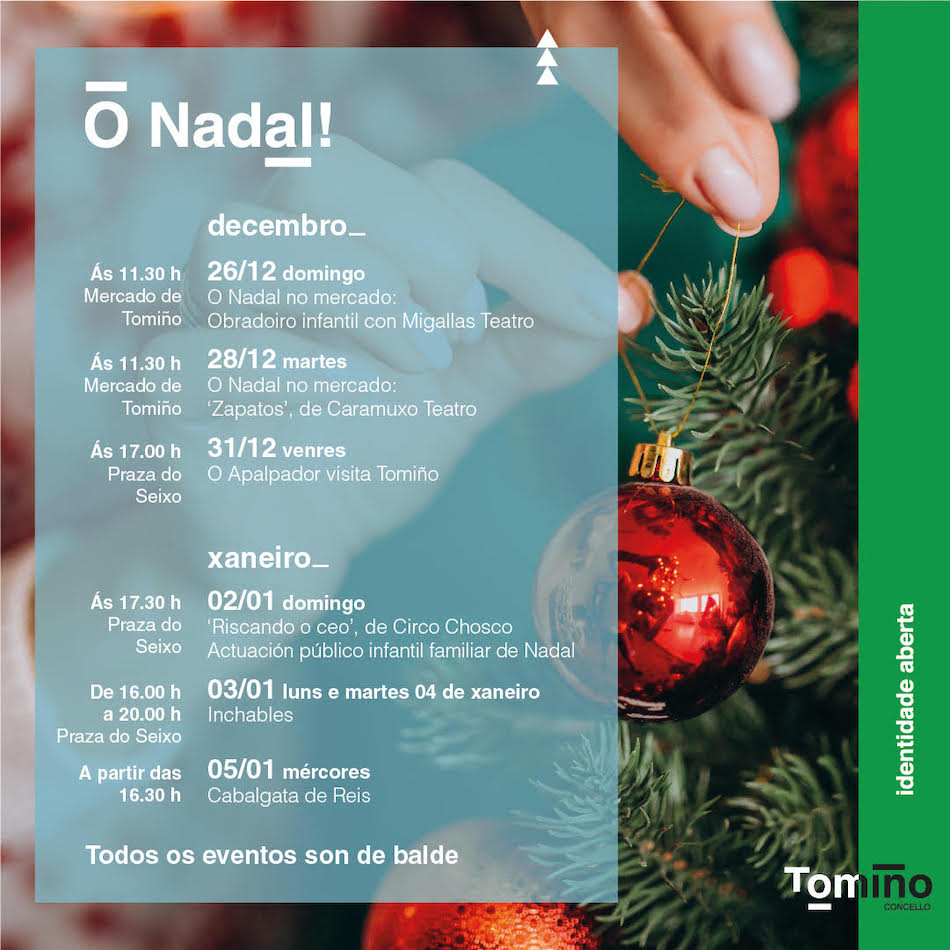 El miércoles, 5 de enero, a partir de las 16.30 horas, Cabalgata de Reyes. Como cada año, la tradicional Cabalgata recorrerá las principales calles del núcleo urbano de Tomiño, llegando a la Praza do Seixo, donde sus Majestades recibirán a niños y niñas con sus cartas.