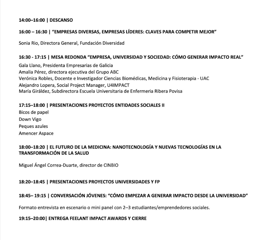 El fundador de Feelant, Ramiro González, subrayó la relevancia del encuentro al afirmar que “este encuentro sitúa a Vigo en el mapa del impacto social, reuniendo a personas y organizaciones que están trabajando para transformar la economía y dar respuesta a los grandes desafíos actuales. Además, queremos poner el foco en los jóvenes como una de las grandes palancas de cambio, acercándoles a estos retos y conectando su talento con proyectos de impacto”.