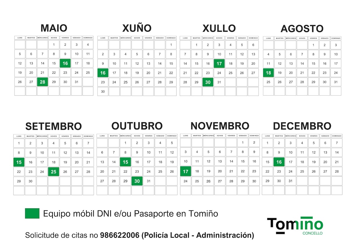 La atención en estas nuevas oficinas móviles, para la que se necesita cita previa, permitirá obtener los documentos en el mismo día. Para pedir las citas y obtener información sobre la documentación necesaria a llevar, hay que llamar a la Policía Local de Tomiño, en el teléfono 986 622 006, o pasar por sus oficinas en horario de 9:00 a 14:00 horas (A Rocha, 8 – Tomiño).