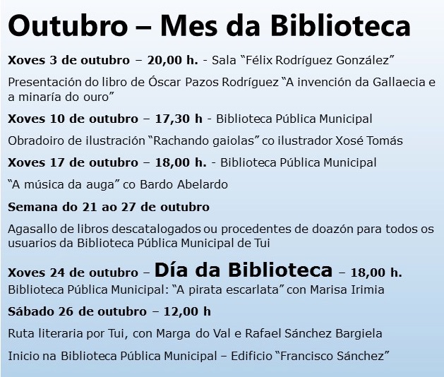 Por outra parte na semana do luns 21 ao domingo 27 de outubro a Biblioteca Municipal tudense ofrecerá un agasallo de libros descatalogados ou procedentes de doazóns a todos os usuarios que se acheguen ata este centro bibliotecario.