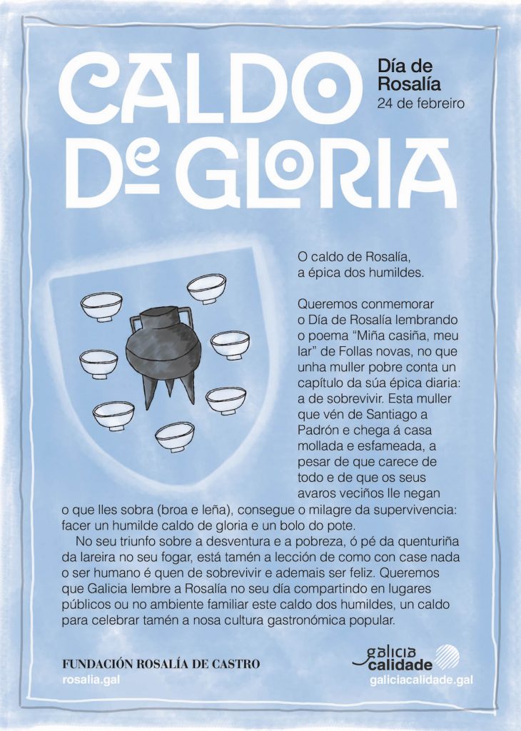 A concelleira de Cultura, Sonsoles Vicente, sinala así que con esta proposta “sumámonos á iniciativa promovida dende a Fundación Rosalía de Castro”. Na mesma, a partir do poema “Miña casiña, meu lar” (Follas novas, 1880), no que unha muller pobre que chega á casa mollada e esfameada, a pesar de que carece de todo, consegue o milagre da supervivencia: facer un humilde caldo de gloria e un bolo do pote, quentarse ó pé do lume e ser feliz. “Queremos que Galicia, sinalan dende a Fundación Rosalía de Castro, lembre a Rosalía no seu día compartindo en lugares públicos ou no ambiente familiar este caldo de gloria dos humildes, un caldo para celebrar tamén a nosa cultura gastronómica popular”.