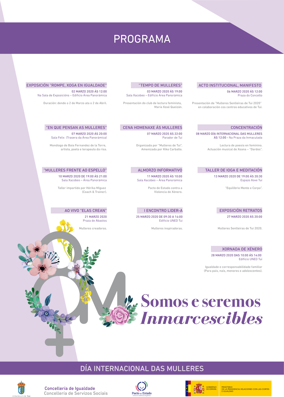Ás actividades continuarán a próxima semana, o luns ás 19 h co obradoiro “Mulleres fronte ao espello” impartido pola coach Hérika Míguez e o martes ás 10 h cun almorzo informativo sobre o Pacto de Estado no que intervirá Laura Seara, avogada e exsecretaria de Estado de Igualdade. Trátase dun evento dirixido a empresas, profesionais, centros educativos, administracións, e público en xeral. Ambas citas serán na Sala Xacobeo da Área Panorámica. Xa o venres, 13 de marzo, ás 19 h no Espazo Xove na rúa Sanz terá lugar o taller ioga e meditación “Equilibrio mente e corpo” a cargo de Vanesa Rodríguez Martínez. Nestas tres actividades é recomendable inscrición previa en igualdade@tui.gal ou no 986 60 36 25 ext 54.