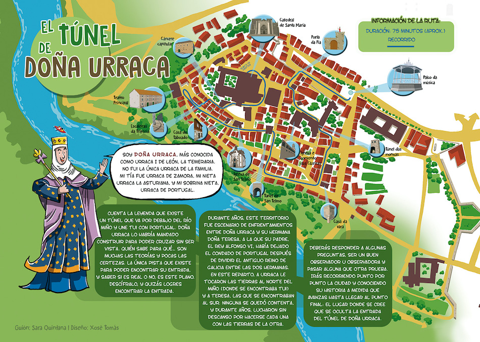La historiadora Sara Quintana explicó que la idea con la que se desarrolló este proyecto fue “crear un producto turístico, educativo y cultural que plasmara de manera general y con cierta profundidad la historia de Tui”. Indicó la ruta de “O túnel de dona Urraca”, con una duración de 75 minutos “está planteada con un recorrido por el conjunto histórico en torno a la Catedral”, y la otra “O tesouro de Salomón”, con una duración de 120 minutos, abarcaría una zona más amplia.