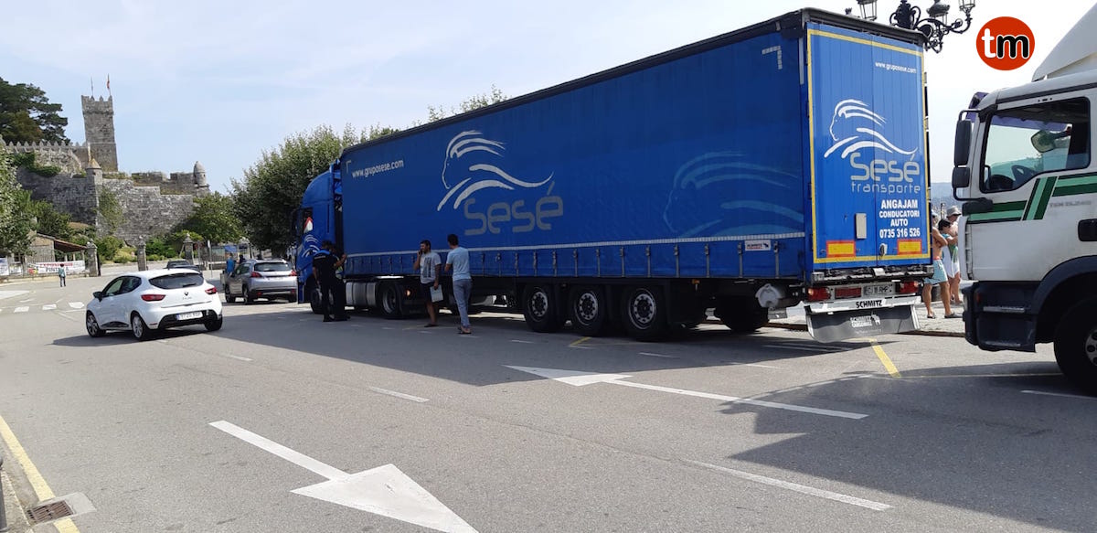 Un camión con matrícula extranjera protagonizó un aparatoso accidente este mediodía en pleno centro de Baiona, afortunadamente sin provocar heridos.
