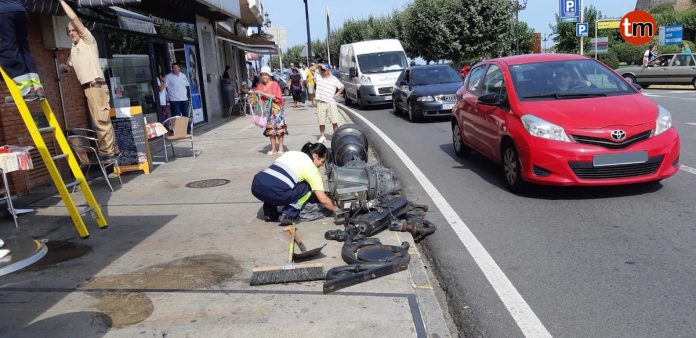 En la maniobra derribó con una farola cayendo ésta encima de la terraza de la cafetería Monterrei, tirando el toldo y las mesas. Afortunadamente no había nadie en esa zona de la terraza lo que evitó males mayores.