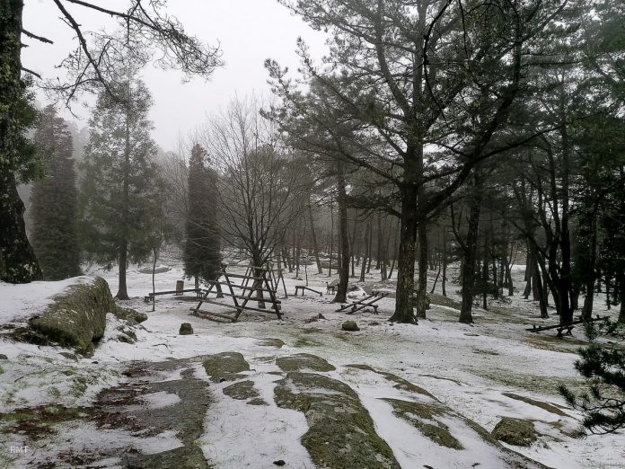 La llegada de una masa de aire polar provocó una caída brusca de las temperaturas. El termómetro marcaba a las 14:00 horas 2,3º en el Monte Aloia, lo que transformó las lluvias caídas en copos de nieve que plasmaron con fotografías y vídeos los allí presentes.