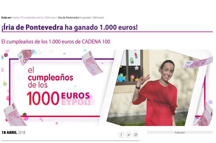 Iria González fue la afortunada de hoy y se lleva uno de los premios más buscados en las emisoras radiofónicas musicales españolas. Iria nació en Tui pero reside en Gondomar. Trabaja en la guardería “Pequerechos” de Vilariño, Nigrán, con tres compañeras más. “Todos los días a las 9:20 horas escuchamos la radio para ver si sale nuestro cumpleaños, y hoy salió el mío, el 16 de julio,” comentó la ganadora.