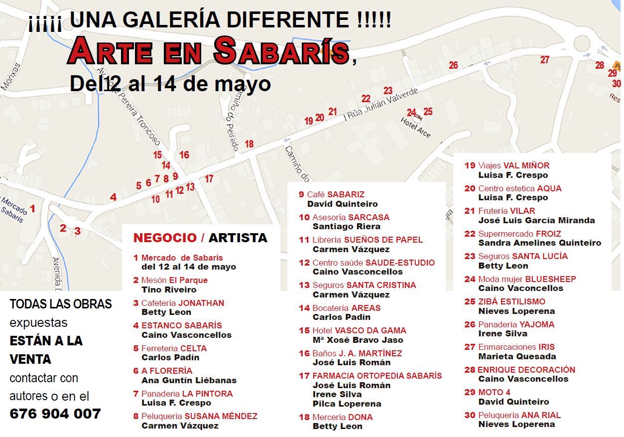 Un plano muestra la ruta del arte en Sabarís que se podrá visitar a cualquier hora del día. Asimismo, tras el éxito de la puesta en marcha por primera vez del I Certamen de Pintura Rápida al aire libre en Sabarís “Chicho Solveira”, la Asociación de Comerciantes y Empresarios de Sabarís (COEMSA) y la Asociación de Empresarios y Comerciantes del Val Miñor (OVALMI) vuelven a convocar este certamen, con el que recuerdan la figura de este vecino de la parroquia, gran amante de la pintura. El certamen, que se celebrará el próximo domingo 14 de mayo en las calles de este lugar, también tiene como objetivo fomentar y despertar la creatividad artística a través de la pintura.