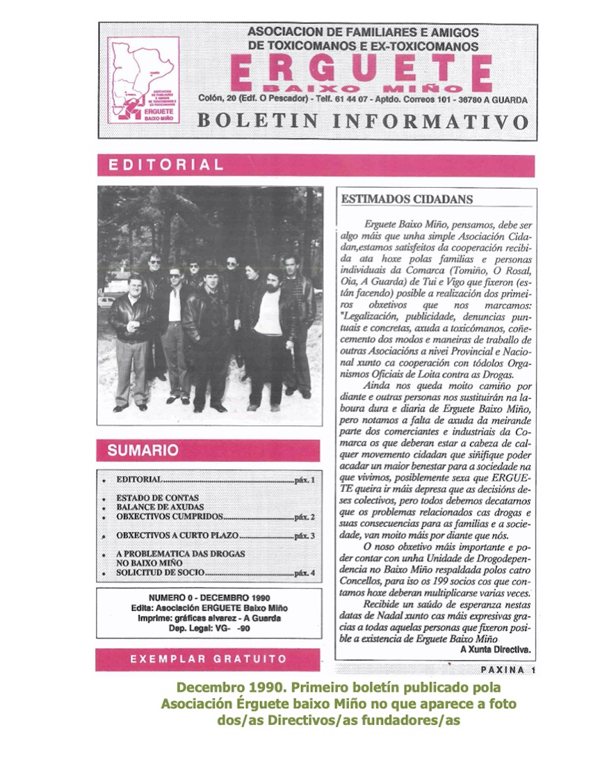 Comezouse a editar unha revista/boletín de información e de sensibilización social en formato papel que se mantivo durante 17 anos, dende decembro 1990 ata setembro 2007, sacando á rúa un total de 21 números. Realizáronse unhas Xornadas sobre “Drogas, medios de comunicación social e movemento asociativo” celebradas no Centro Cultural de A Guarda os días 29 e 30 de novembro de 1997. Estas xornadas foron programadas e organizadas pola FEGAD (Federación Galega de Asociacións de Axuda ó Drogodependente) que presidía Manuel Varela Veiga, e entre os xornalistas intervintes estiveron José Luís Manso Preto (autor do libro Minho Conettion), Rui Pereira (xornalista do Expreso) e Fernando Rodríguez Méndez (Máster en Drogodependencias e Sida e con varios premios sobre xornalismo en drogodependencias). A este encontro asistiron máis de medio cento de representantes das 44 Asociacións Galegas dentro da FEGAD, participando os alcaldes de ambas ribeiras do Miño. Por desgraza para nós a FEGAD desapareceu por falta de financiamento oficial.