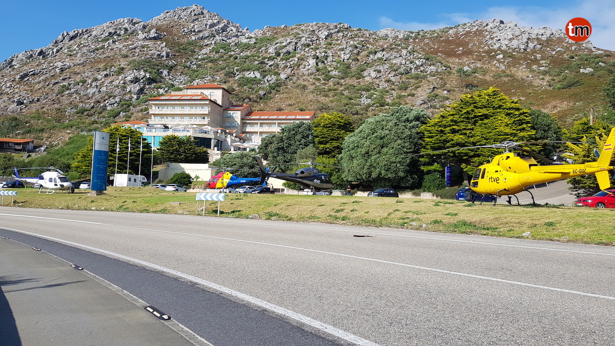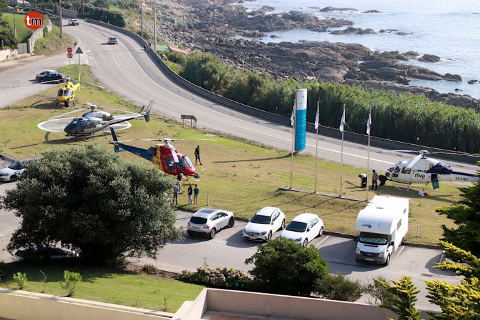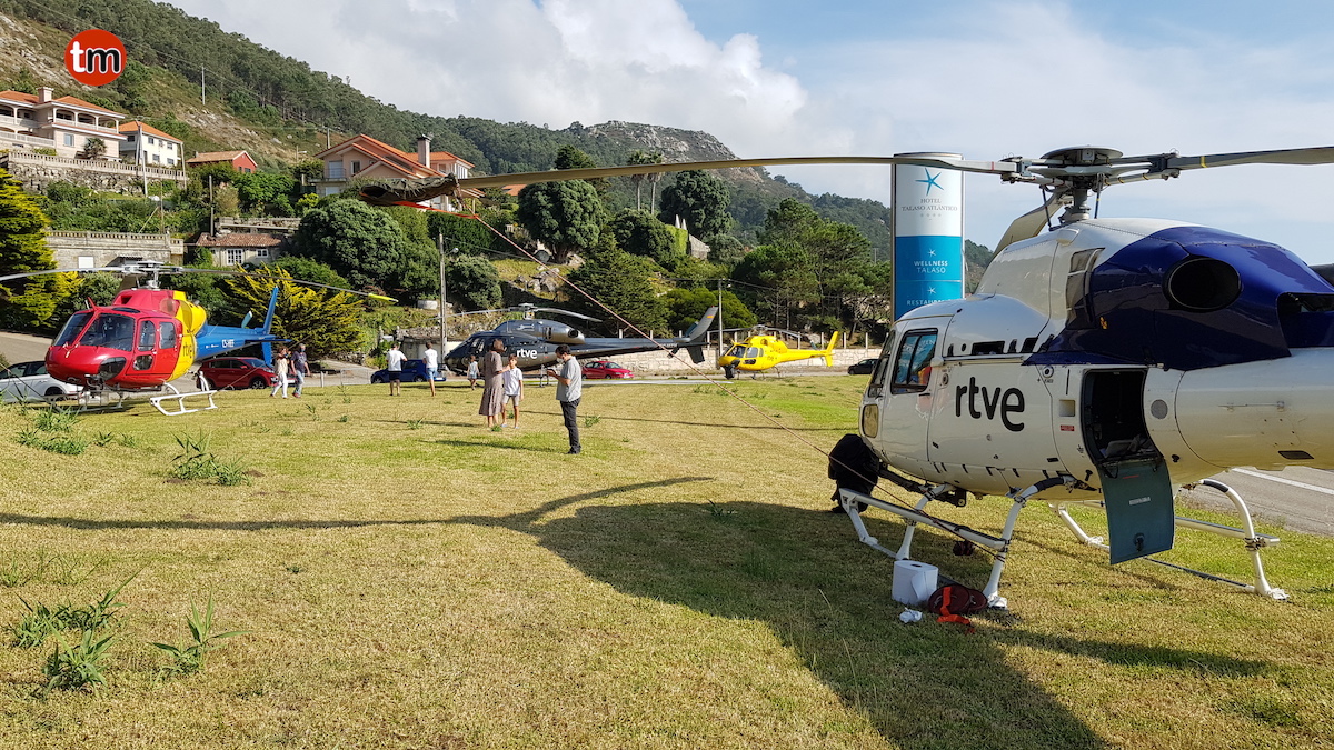 Los cuatro helicópteros que a vista de pájaro nos muestran imágenes tan imprescindibles como espectaculares, descansan en el jardín del Talaso Atlántico de Oia, para mañana sobrevolar el sur de la provincia. Esta tarde llegaron rodeados de mucha expectación, ya que no es muy habitual ver a cuatro de estas aeronaves juntas en un mismo lugar. Decenas de personas se acercaron para ver los helicópteros y fotografiarse con ellos.
