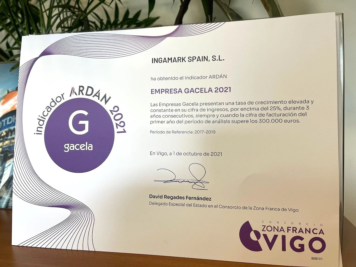 La Zona Franca de Vigo ha reconocido a la empresa tudense Ingamark Spain S.L. con el Indicador Ardan de Gacela 2021 de Buenas Prácticas Empresariales por ser una de las compañías que más ha crecido en los últimos tres años en su sector.